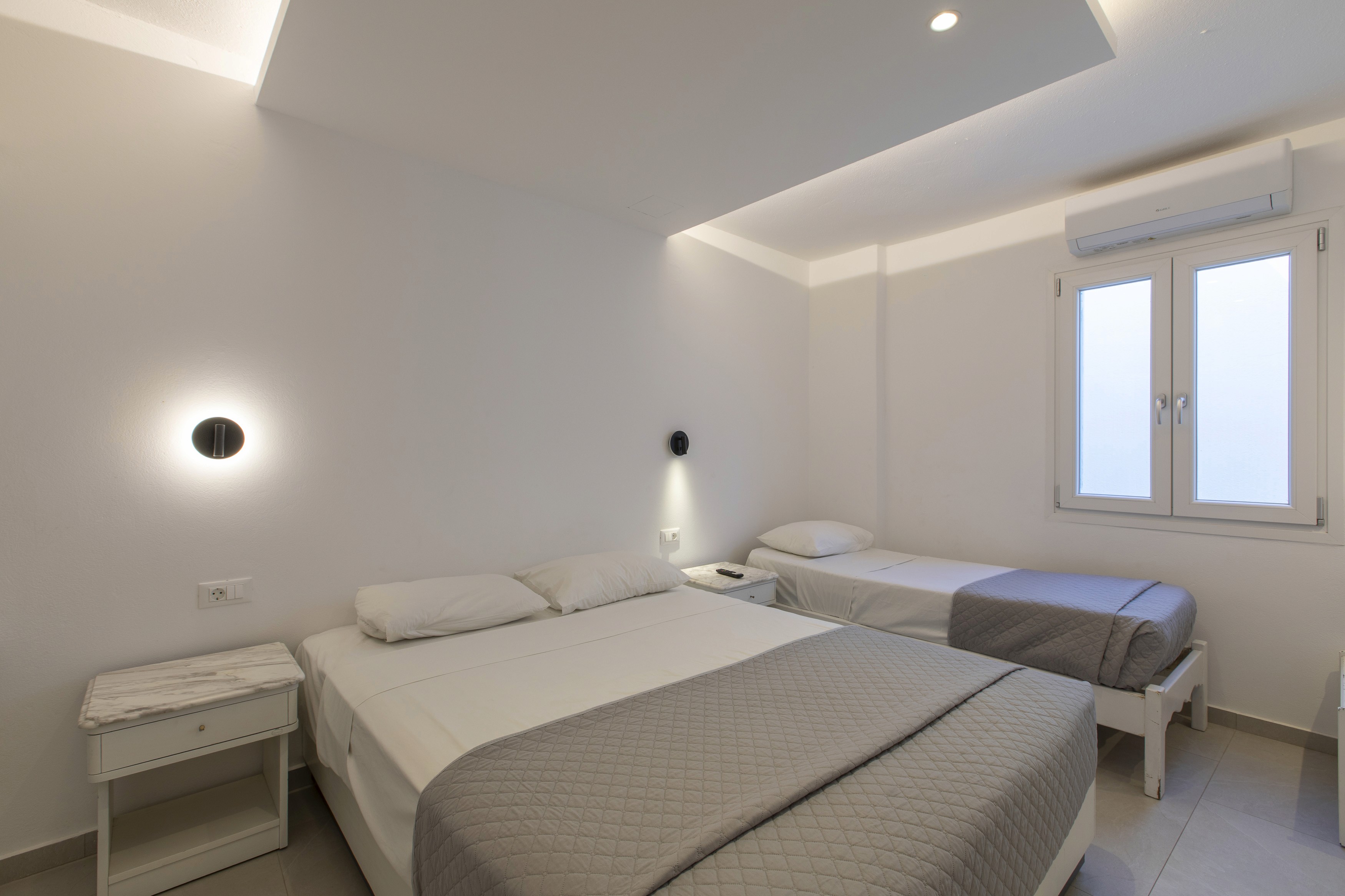 I bagni, in microcemento, hanno docce a pioggia e finiture essenziali. Comfort moderni inclusi: A/C, Wi-Fi, illuminazione soft e tende oscuranti.